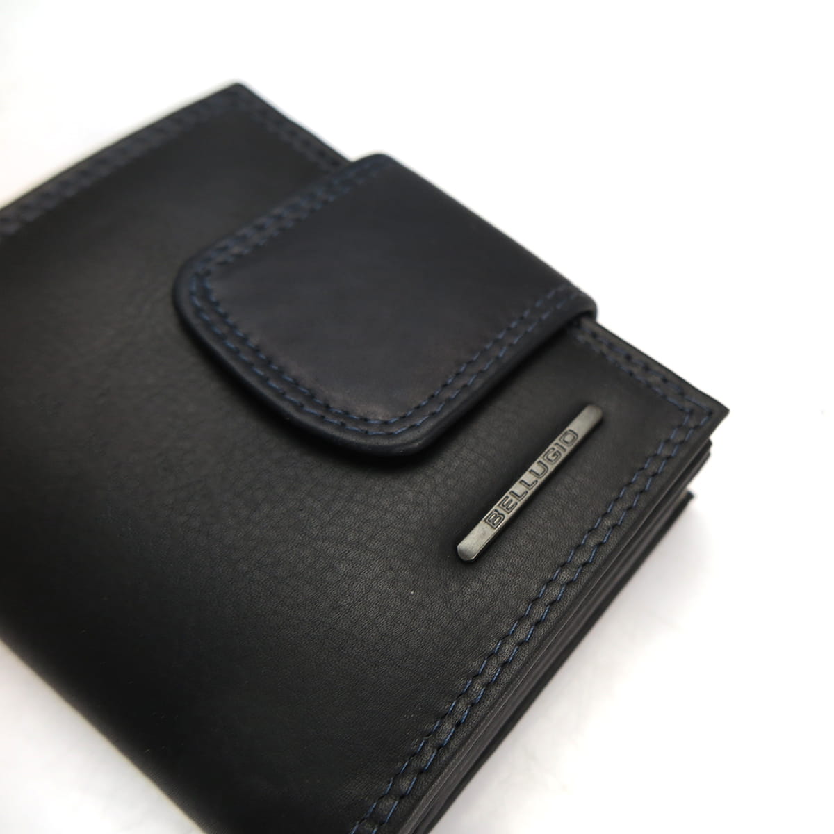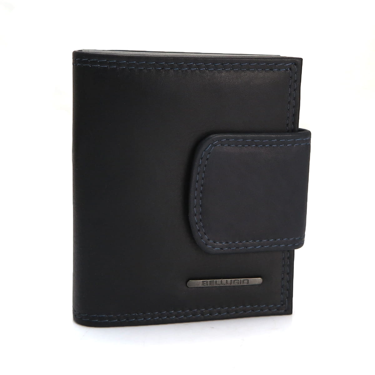 Ponadto na zewnątrz portfela znajduje się kieszonka na bilon, dzielona przegrodą, którą zamyka elegancki bigiel.