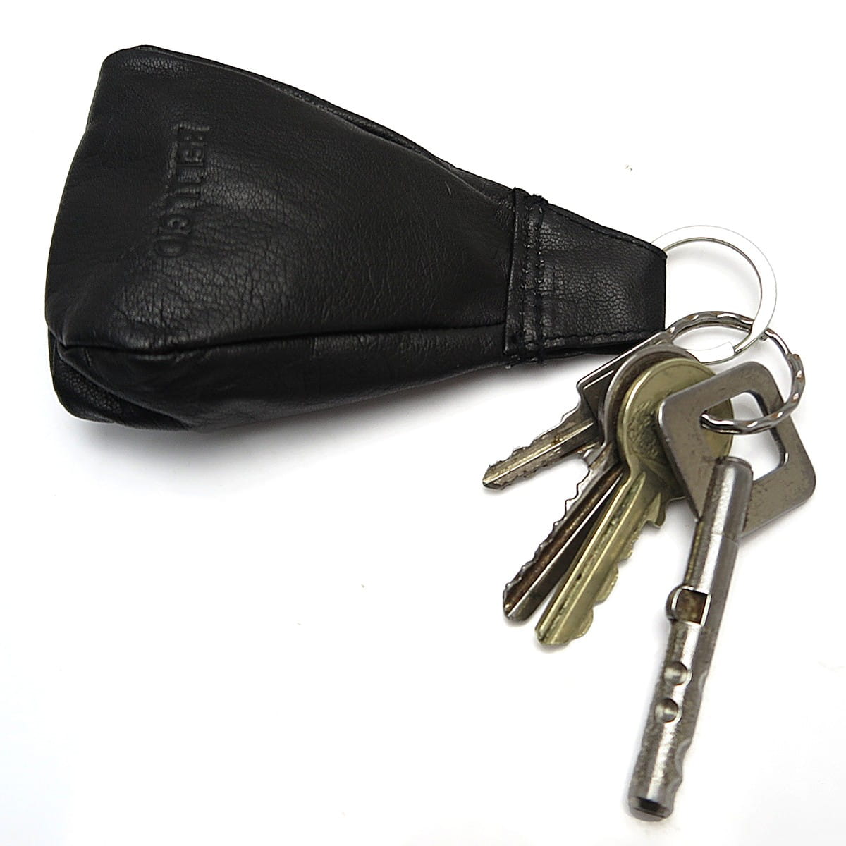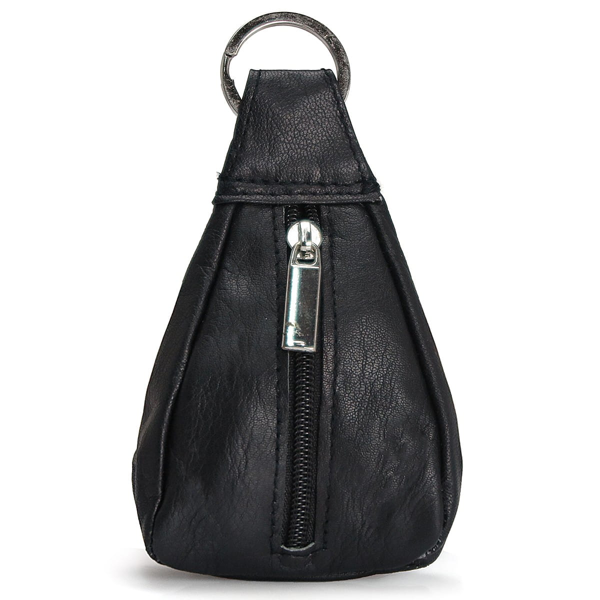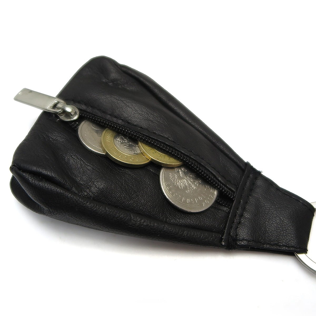 Skórzane etui na klucze uniseks. Poręczne etui w kształcie dzwonka z kieszonką na zamek błyskawiczny.