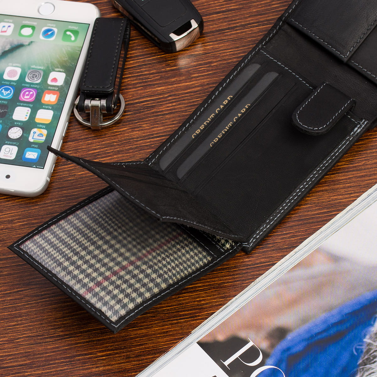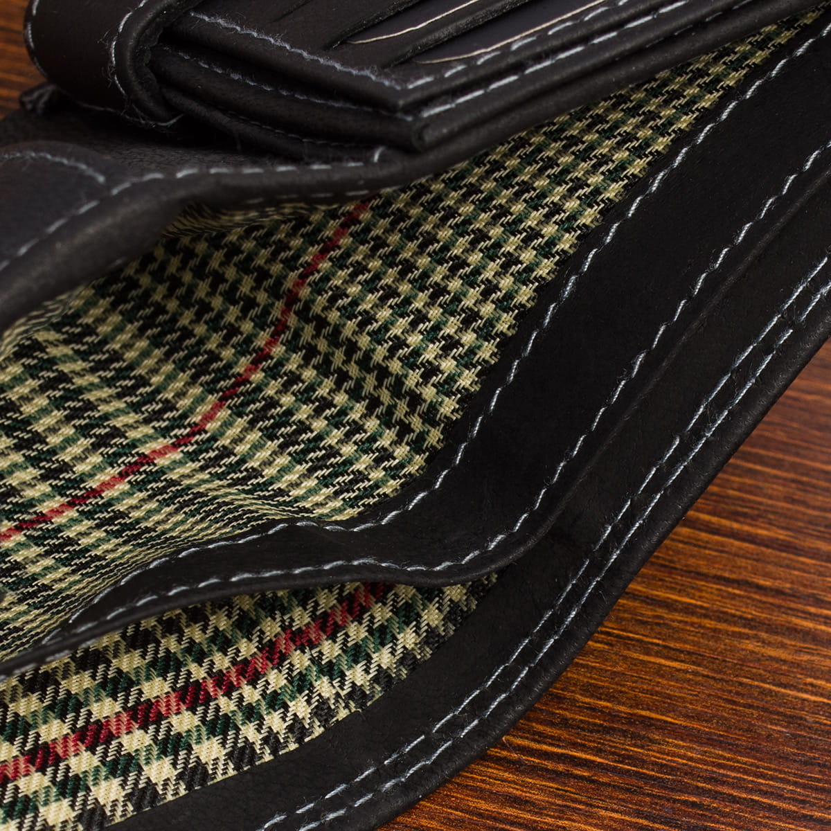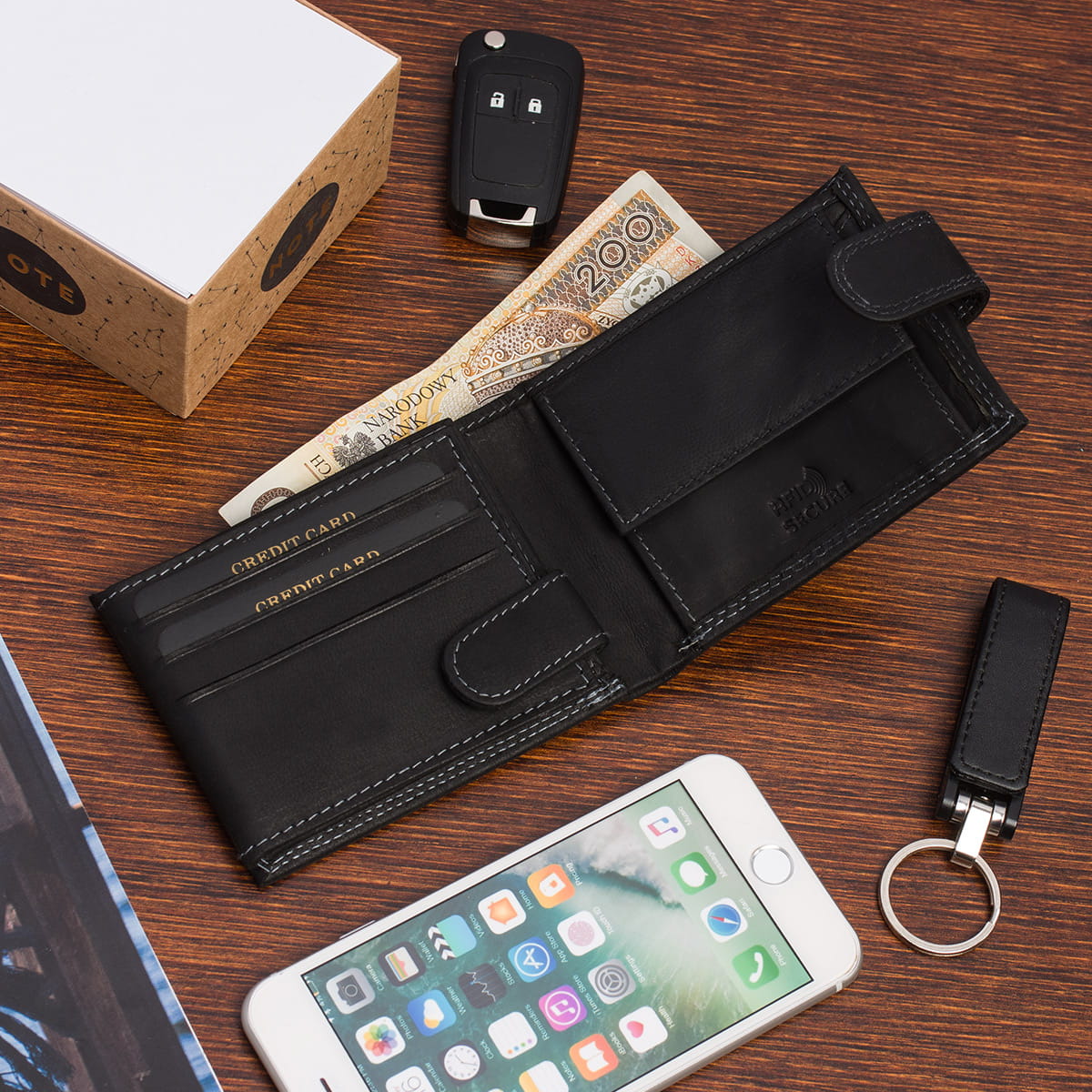 Portfel jest rozkładany dwukrotnie, sekcja na karty jest dodatkowo zapinana na zatrzask.
