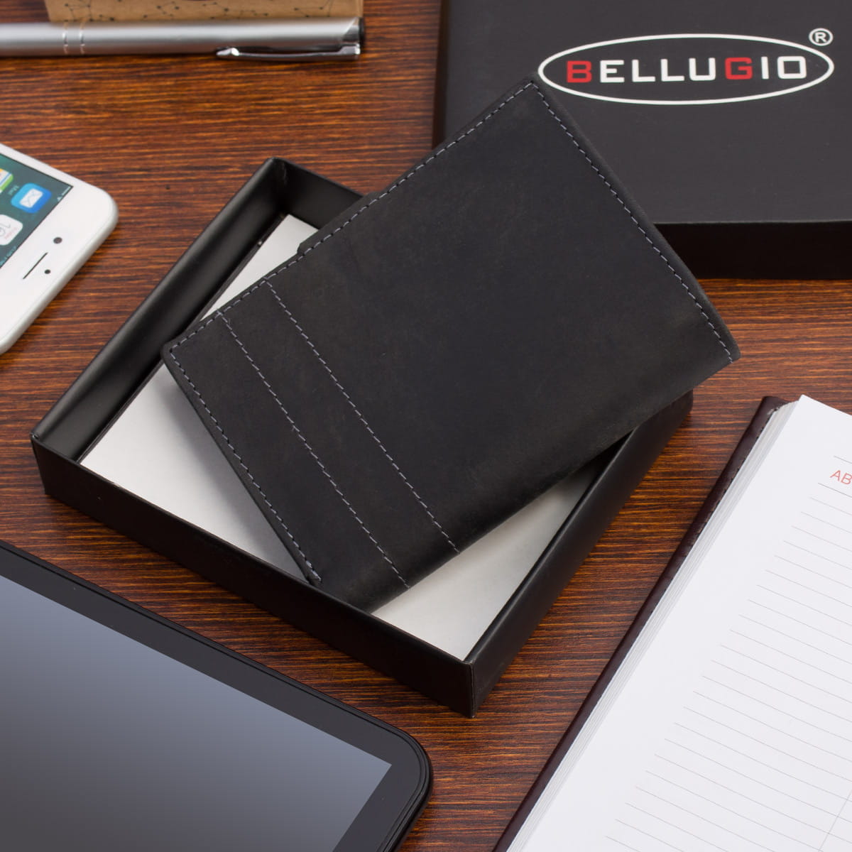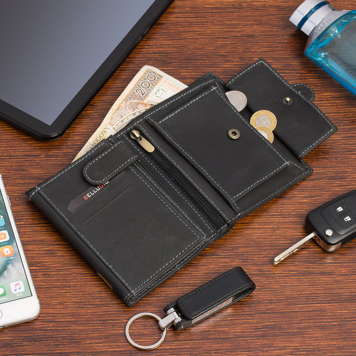 Portfel męski Bellugio® został wykonany z najwyższej jakości skóry naturalnej, która dzięki swojej niskoporowatości jest wyjątkowo gładka i przyjemna w dotyku. Jasne przeszycia oraz jaśniejsza skórzana łatka z wytłoczonym logo producenta nadają mu wyjątkowego charakteru i podkreślają elegancki, klasyczny styl.