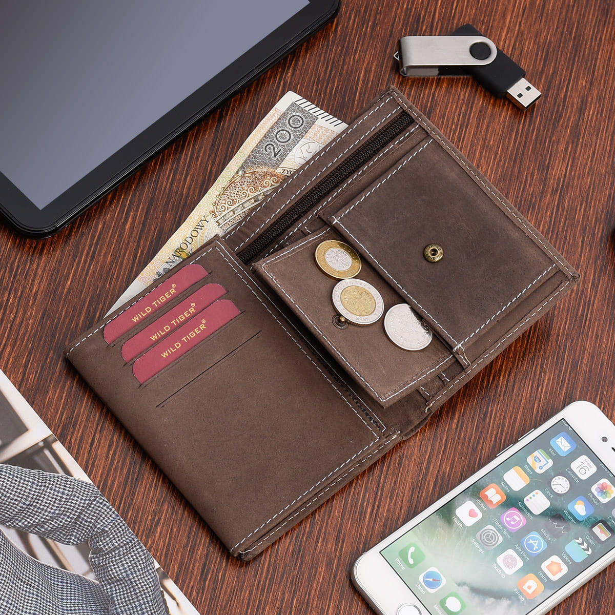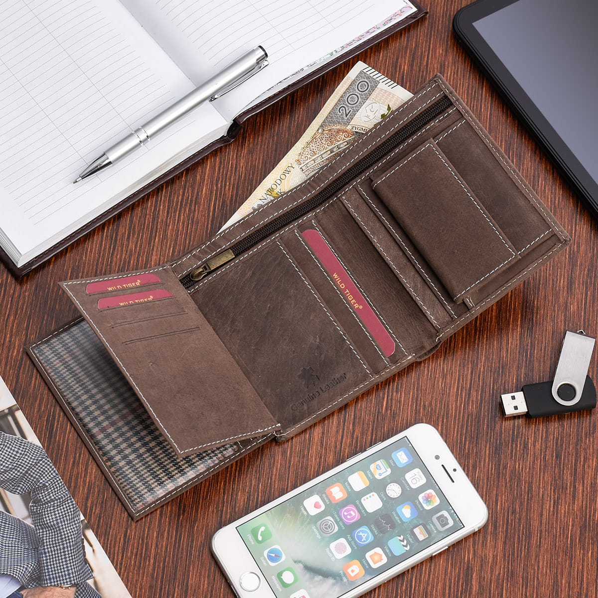 Naturalna skóra, staranne szycie oraz wysokiej jakości okucia gwarantują długowieczność i odporność na codzienne użytkowanie. Każdy portfel WILD TIGER to synonim solidności, męskiego charakteru i ponadczasowego stylu.