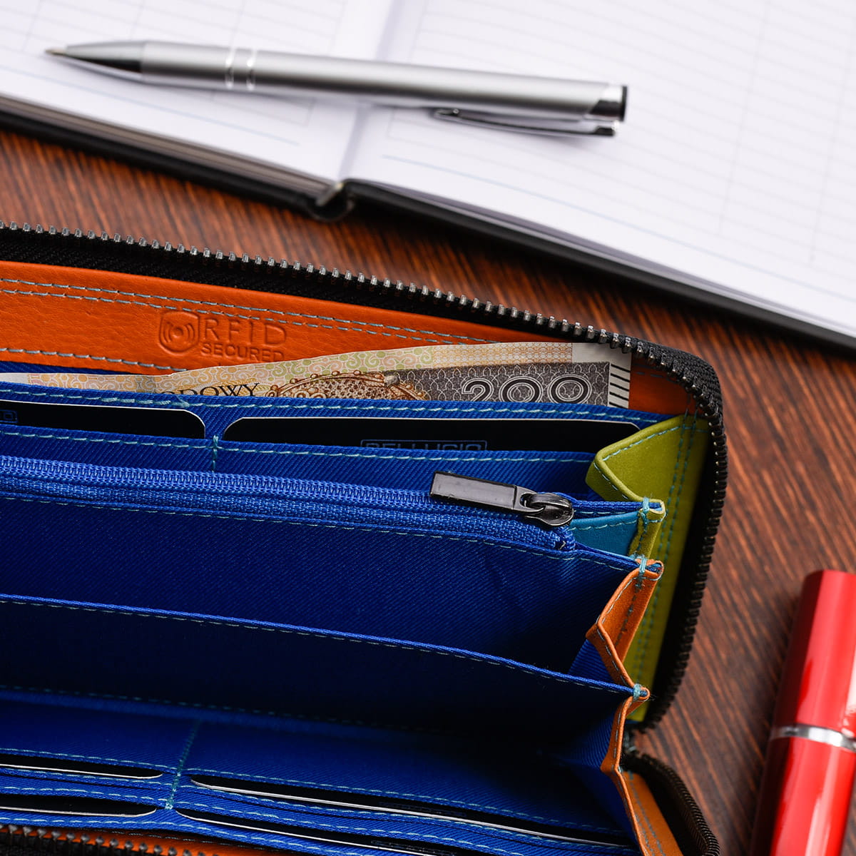 Dla zwiększenia bezpieczeństwa, portfel wyposażono w technologię RFID Secure, która skutecznie chroni dane zapisane na kartach zbliżeniowych przed nieautoryzowanym odczytem.