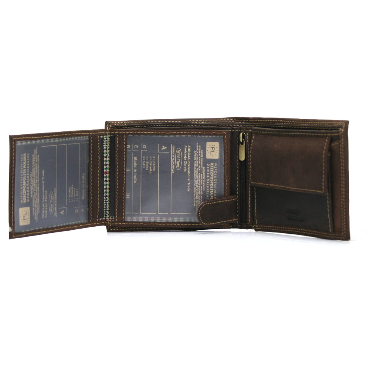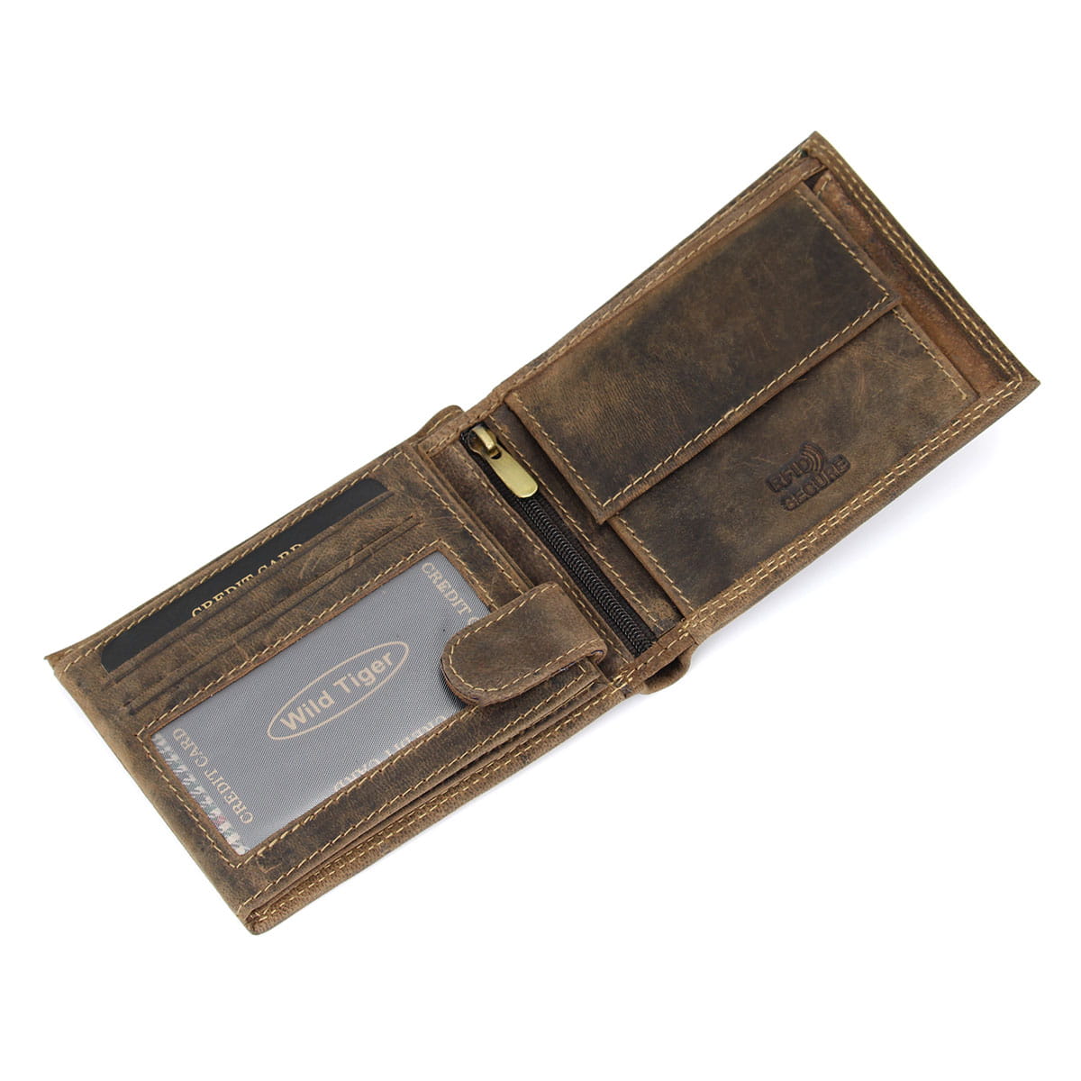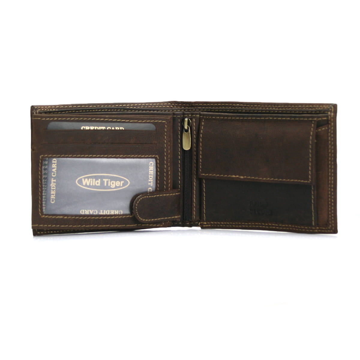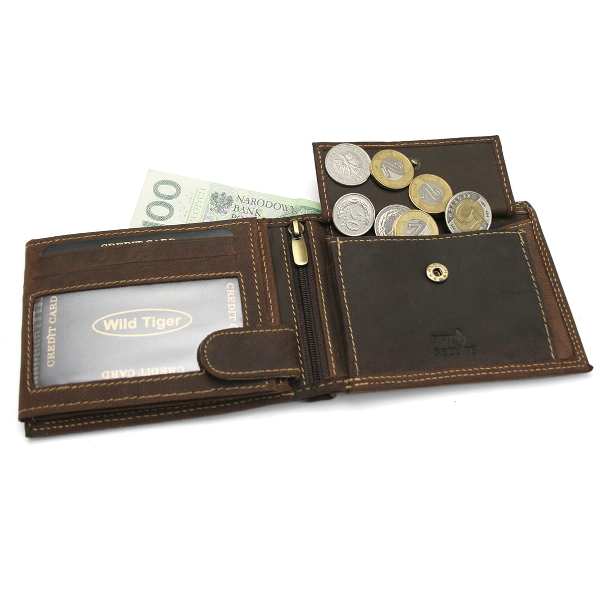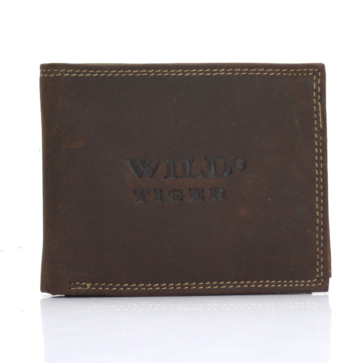 Portfel męski Wild Tiger wykonany z wysokiej jakoś naturalnej skóry nubukowej, która charakteryzuje się pomarszczoną strukturą oraz matowym połyskiem.