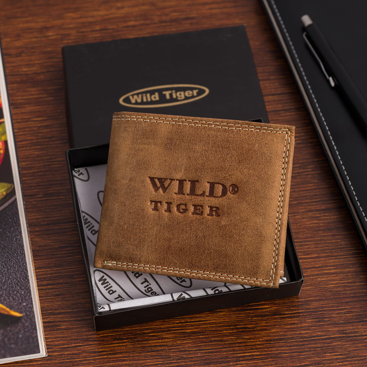 Męski portfel Wild Tiger został wykonany z najwyższej jakości, solidnej skóry naturalnej, której subtelny połysk nadaje eleganckiego charakteru. To klasyczny model z pojedynczym zapięciem na zatrzask, zaprojektowany z myślą o mężczyznach ceniących porządek i niezawodność.