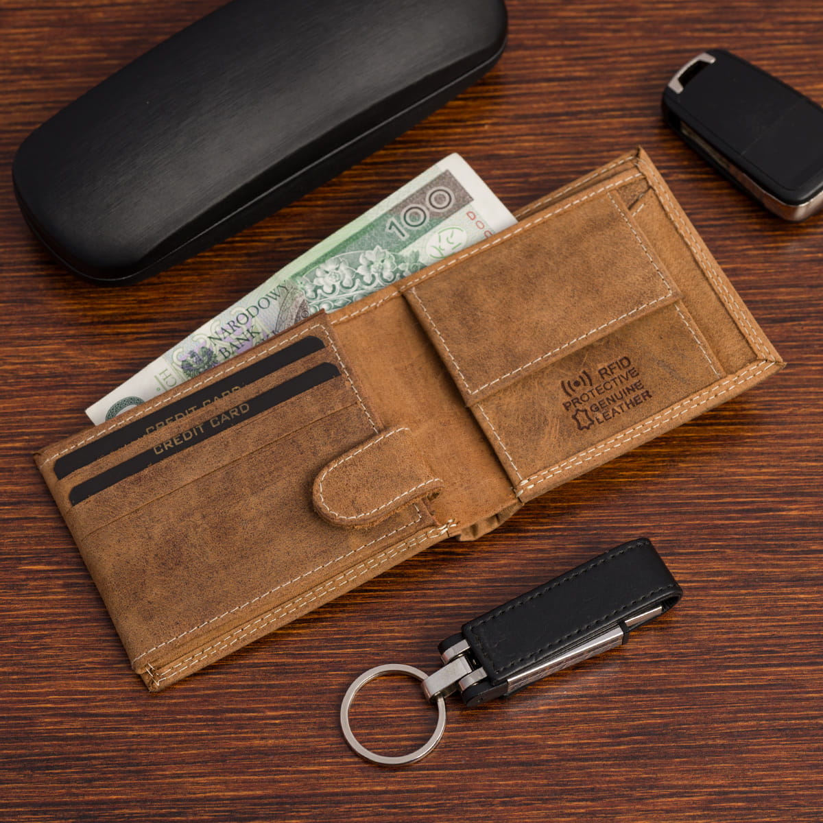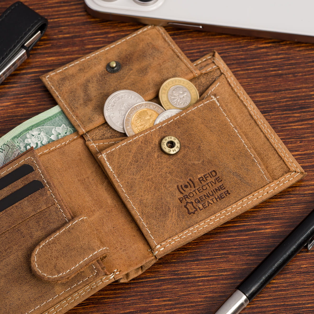 Autentyczność portfela potwierdzają dwa wytłoczenia: „genuine leather” – oznaczające wykonanie z prawdziwej skóry naturalnej najwyższej jakości, oraz RFID Secure – informujące o obecności wkładki antykradzieżowej. Wbudowany system RFID chroni dane na kartach zbliżeniowych przed niepożądanym odczytem.