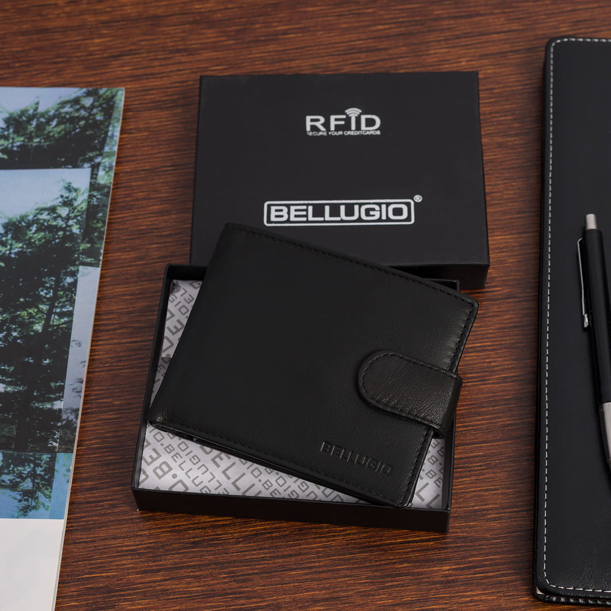 Męski portfel Bellugio® to połączenie klasyki i ponadczasowej elegancji. Wykonany z solidnej skóry naturalnej o lekkim połysku, łączy trwałość z wyrafinowanym stylem. Dzięki pojedynczemu zapięciu na zatrzask wszystkie Twoje karty, dokumenty i pieniądze pozostaną bezpieczne i na swoim miejscu.