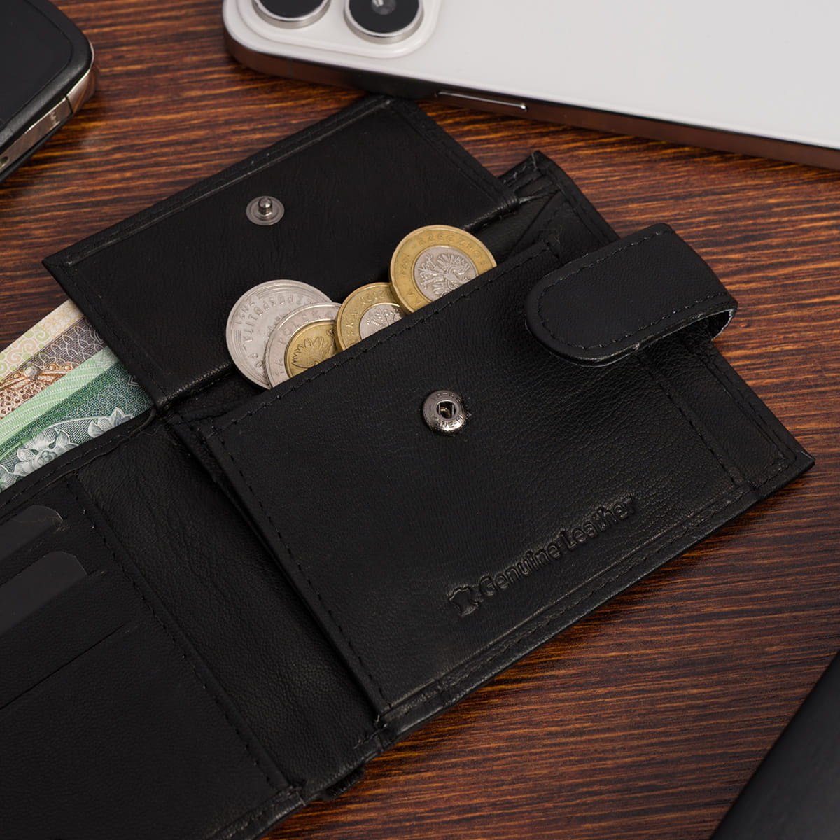 Model wyposażony został w pojedyncze zapięcie na zatrzask, które zapewnia bezpieczeństwo przechowywanych kart, dokumentów i pieniędzy.