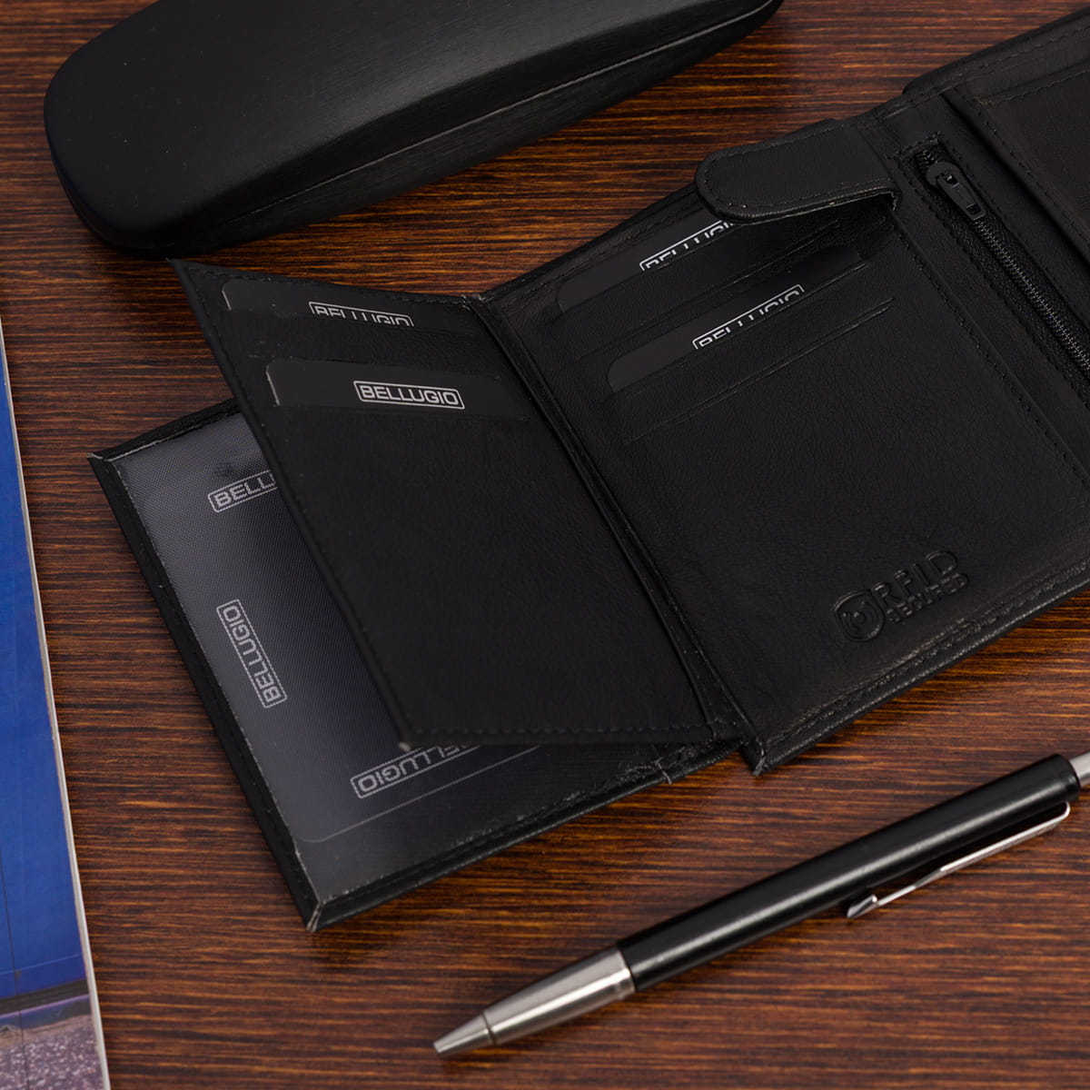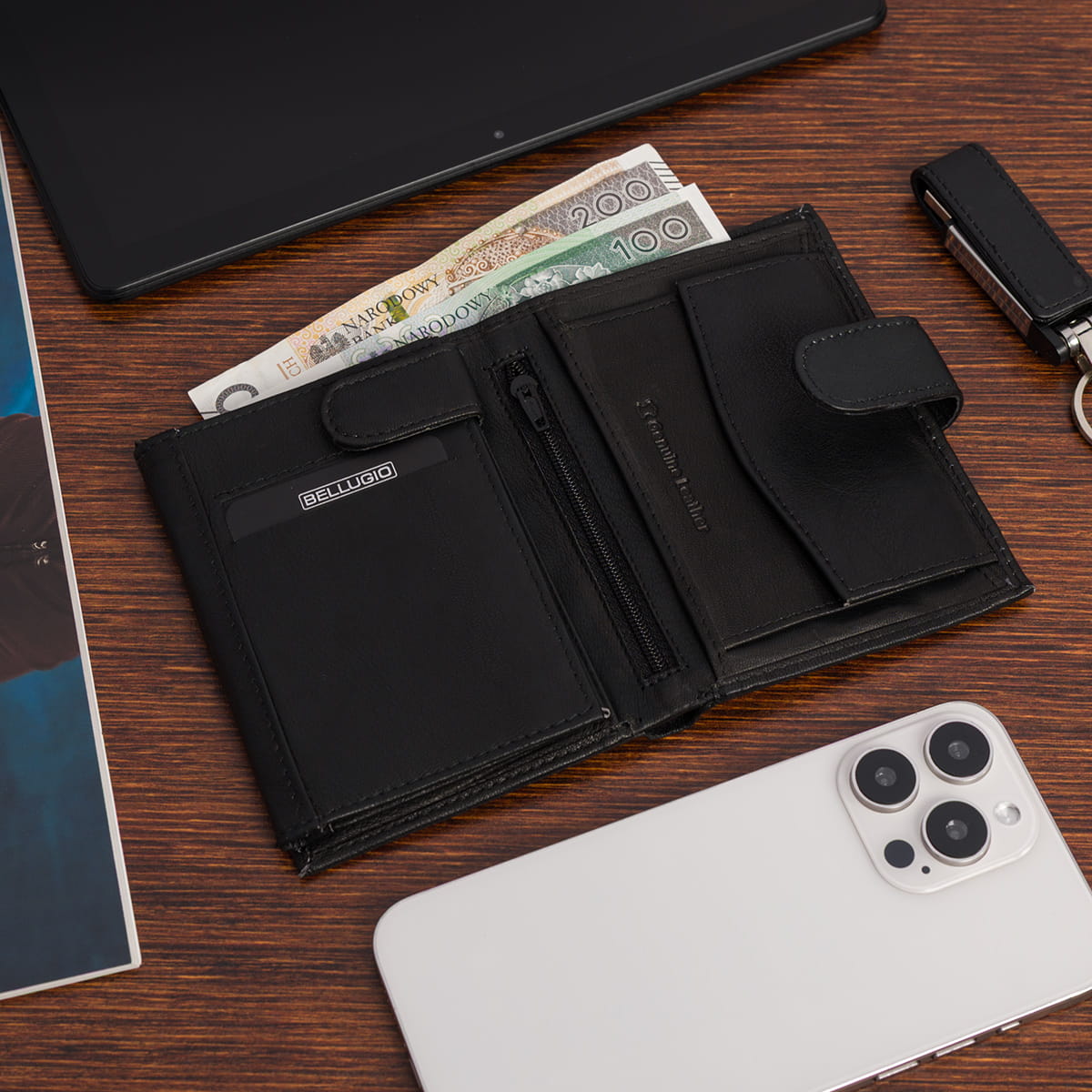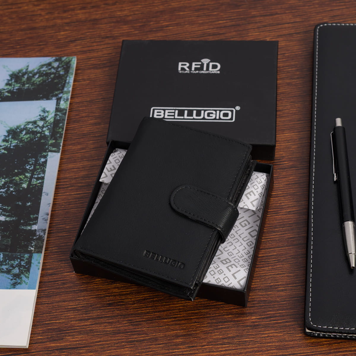 Stylowy portfel męski Bellugio® to kwintesencja klasy i solidności. Wykonany z najwyższej jakości skóry naturalnej, wykończonej subtelnym połyskiem, prezentuje się elegancko i ponadczasowo. Ten model to klasyka w najlepszym wydaniu – praktyczny, trwały i dopracowany w każdym detalu.