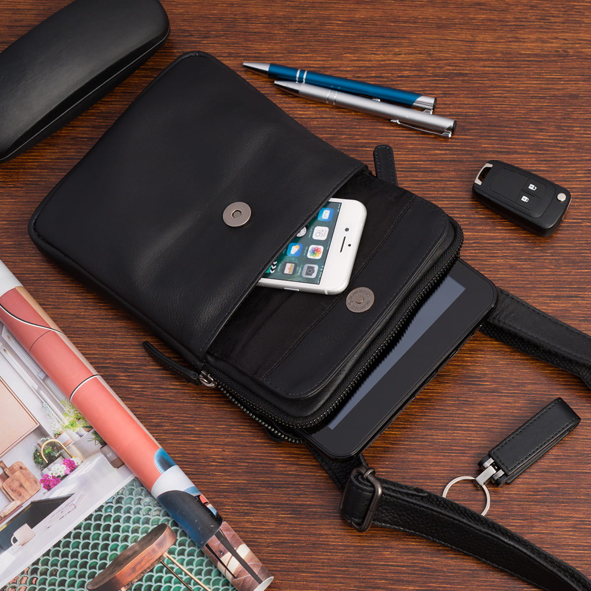 Długi, szeroki i regulowany pasek (ok. 80-140 cm) zapewnia wygodę noszenia saszetki, a przemyślane kieszenie pozwalają na uporządkowanie zawartości tak, jak będzie Ci najwygodniej. Wewnątrz saszetka posiada miękką, materiałową podszewkę.