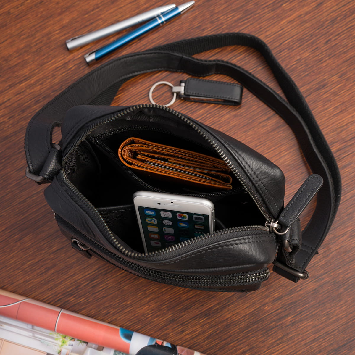 Saszetka wykonana jest z najwyższej klasy skóry naturalnej, która dzięki specjalistycznemu przygotowaniu jest niezwykle miękka, a do tego charakterystycznie pachnie. Saszetka ma głęboki, delikatnie lśniący czarny kolor.