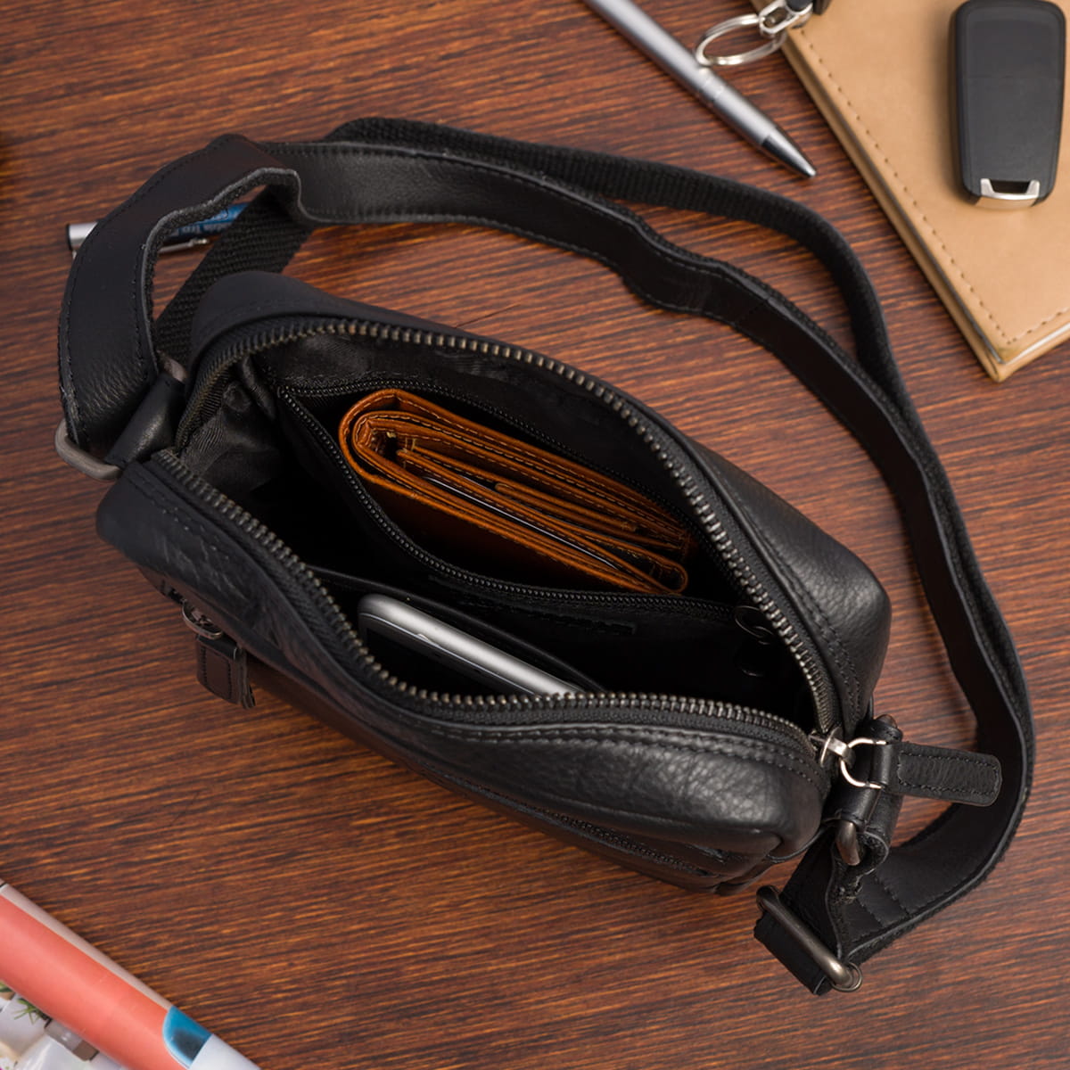 Regulowany, podszyty materiałem pasek (80-140 cm)zapewnia wygodę noszenia saszetki, a przemyślane kieszenie pozwalają na uporządkowanie zawartości tak, jak będzie Ci najwygodniej. Wewnątrz saszetka posiada miękką, materiałową podszewkę.
