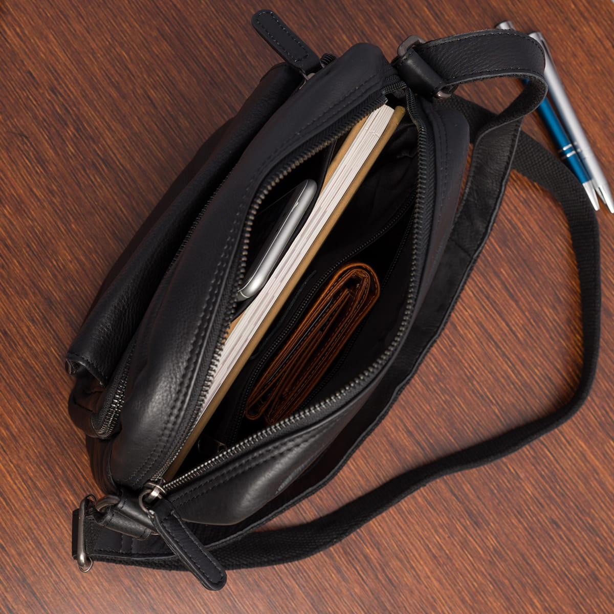 Saszetka wykonana jest z najwyższej klasy skóry naturalnej, która dzięki specjalistycznemu przygotowaniu jest niezwykle miękka, a do tego charakterystycznie pachnie. Saszetka ma głęboki, delikatnie lśniący czarny kolor.